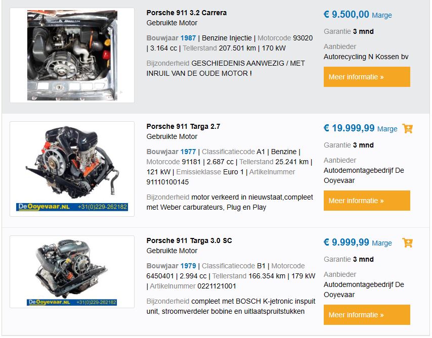 Bedankt is wel een interesant bedrijf zal er is info opvragen , en internet beetje bijhouden maar word wel schaarser die motoren , valt me wel op dat de meeste aanbieders wat ze zelf op voorraad hebben geweldig vinden bv 3.6 maar alles eronder rommel en slecht lopende motoren . dat zal toch wel beetje meevallen gaat mij niet direkt om veel pk of om periode corekt. gewoon een lekker lopende 6 cilinder die achter de 901 bak kan .lijkt me geen bak voor een 3.6