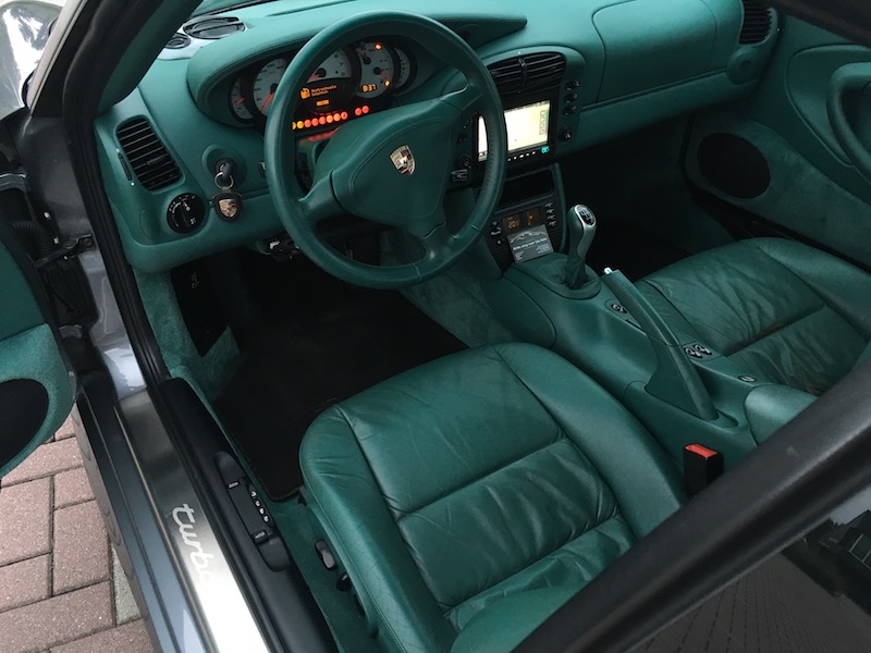 Nette handgeschakelde 996 turbo uit 2001 in de kleur Seal Grey met een Nephrite green interieur. Elektrisch verstelbare voorstoelen met het Porsche wapen in de hoofdsteunen.