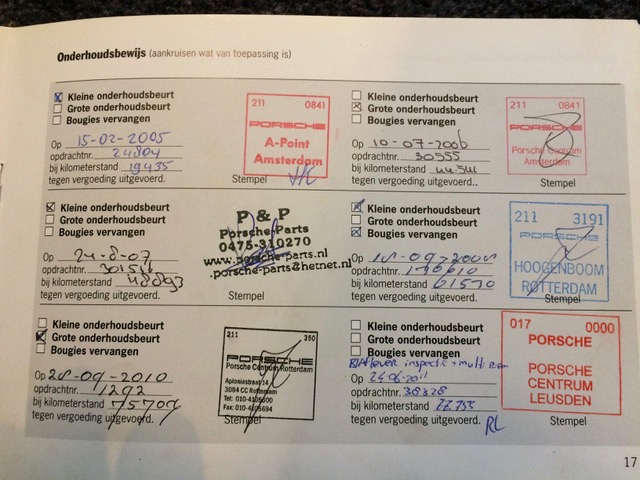 De laatste grote beurt was bij 86650 km bij de Porsche dealer in Heteren, voor 1650 euro, ook remvloeistof ververst, bougies, twee aandrijfashoezen etc.