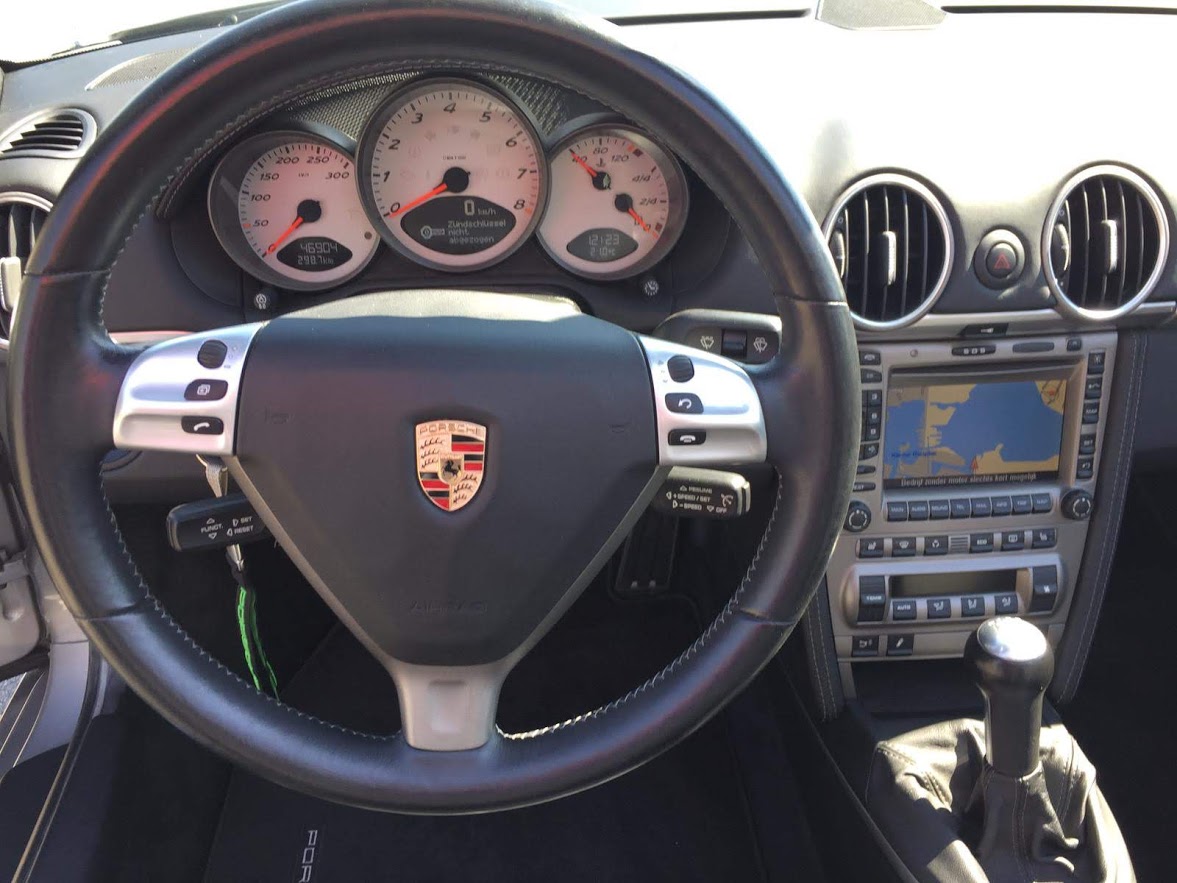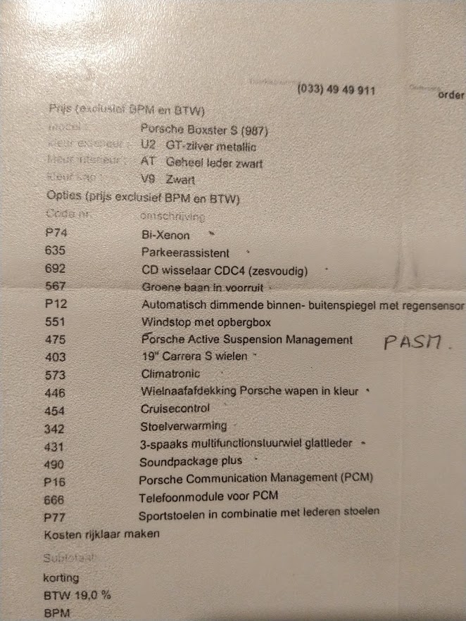 Het betreft een 2005 Boxster S, dus met de 3.2 280pk motor. Met een nieuwprijs destijds van 96k is de optielijst niet onbescheiden maar de meest opvallende zijn: