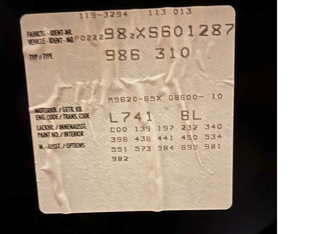 009: 986 2,5 liter cilinderinhoud -> MJ 1999 016: Pakket "Standard" 029: 071: EU-landenuitvoering 139: Stoelverwarming, linker stoel 197: Krachtiger accu 211: Kentekenhouder uitvoering 3 219: Differentieel 232: 271: Buitenspiegel voor bestuurderszijde -asferisch-, elektrisch verstel- en verwarmbaar 273: Buitenspiegels, elektrisch verstel- en verwarmbaar 340: Stoelverwarming, rechter stoel 369: Basisstoel links 370: Basisstoel rechts 396: Gegoten wiel, 17" (AL) 436: 3-spaaks airbagstuurwiel 439: Elektrischecabriokapbediening 441: Radiovoorbereiding 465: Mistachterlicht links 481: 5 versn. handversnellingsbak 488: Opschrift Duits 490: -MJ 01 GeluidspakketMJ 02- Geluidspakket Harmann analoog 499: Uitvoering voor de Bondsrepubliek Duitsland 534: Anti-diefstalinstallatie 539: Mechanische zithoogteverstelling links 551: Windstop 562: Airbag bestuurders- en passagierszijde 566: Mistlamp wit 568: Voorruit zonder groene baan 573: Airconditioning 581: Middenconsole voor 584: Opbergbox 602: Center high-mounted stop lamp 651: Elektrisch portierruitmechanisme 657: Stuurbekrachtiging 695: CD-radio "Porsche CDR 22" RDW 981: Lederen uitvoering zonder stoelbekleding 982: Stoelbekleding voor, scheurleder/leder/leder