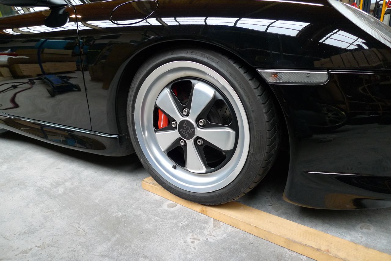 Demo set of 4 Unused Original Fuchs Wheels in 18 x 8 x10 in anodised finish, with Fuchs or Porsche logo hub caps, complete with tires Michelin Pilot Sport 205 en 255 with 80% profile up front and 25% profile rear inner side. We offer this complete set for €3.139,95 shipping. The Fuchs rims were used for a photoshoot only and are unblemished and new. We have second hand Porsche colour crest hub caps available which are slightly faded, but actually look very cool with this classic style wheel. I'll throw those in for free. You will not buy a complete set like this for your 964 Turbo, 993, 993 Turbo, 996 or 997 at this price anywhere.