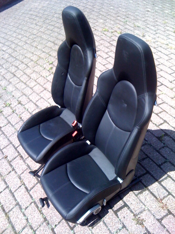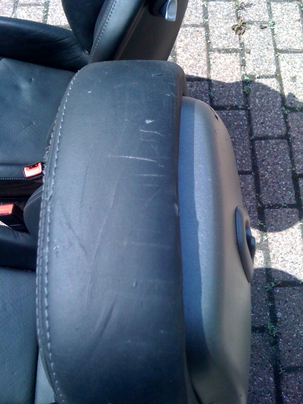 Zwart leder Grijze kunststof rug handbediend (rugleuning electrisch) 2 kleide 'deukjes' in het leder (er heeft iets op gestaan) paar krasjes aan de bovenkant van de bestuurdersstoel airbags OK leder onbeschadigd
