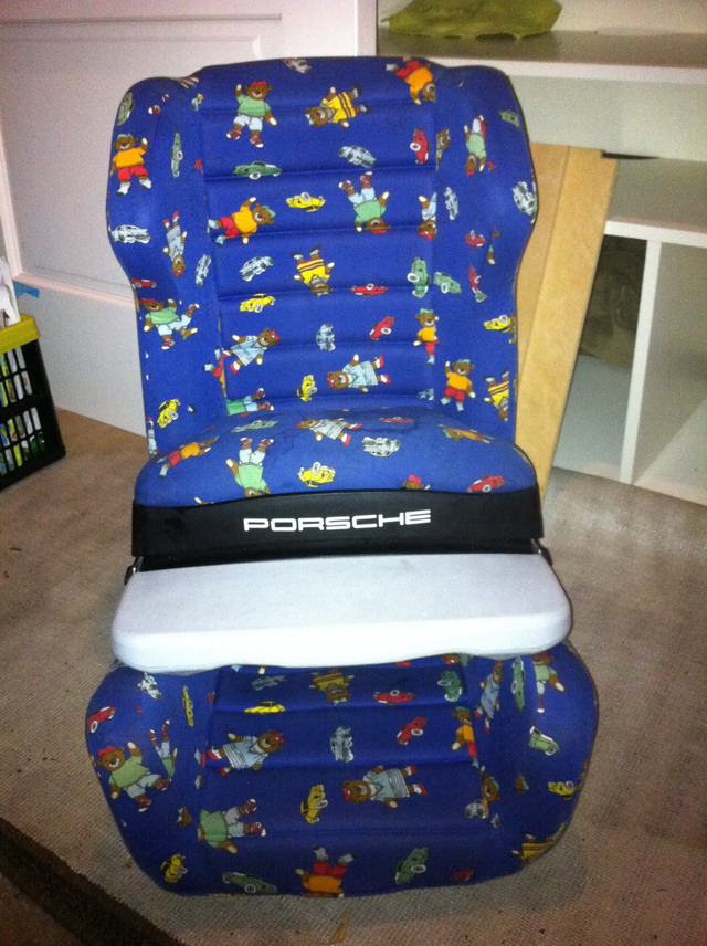 Te koop Porsche kinderstoeltje met van die blauwe beertjes.
