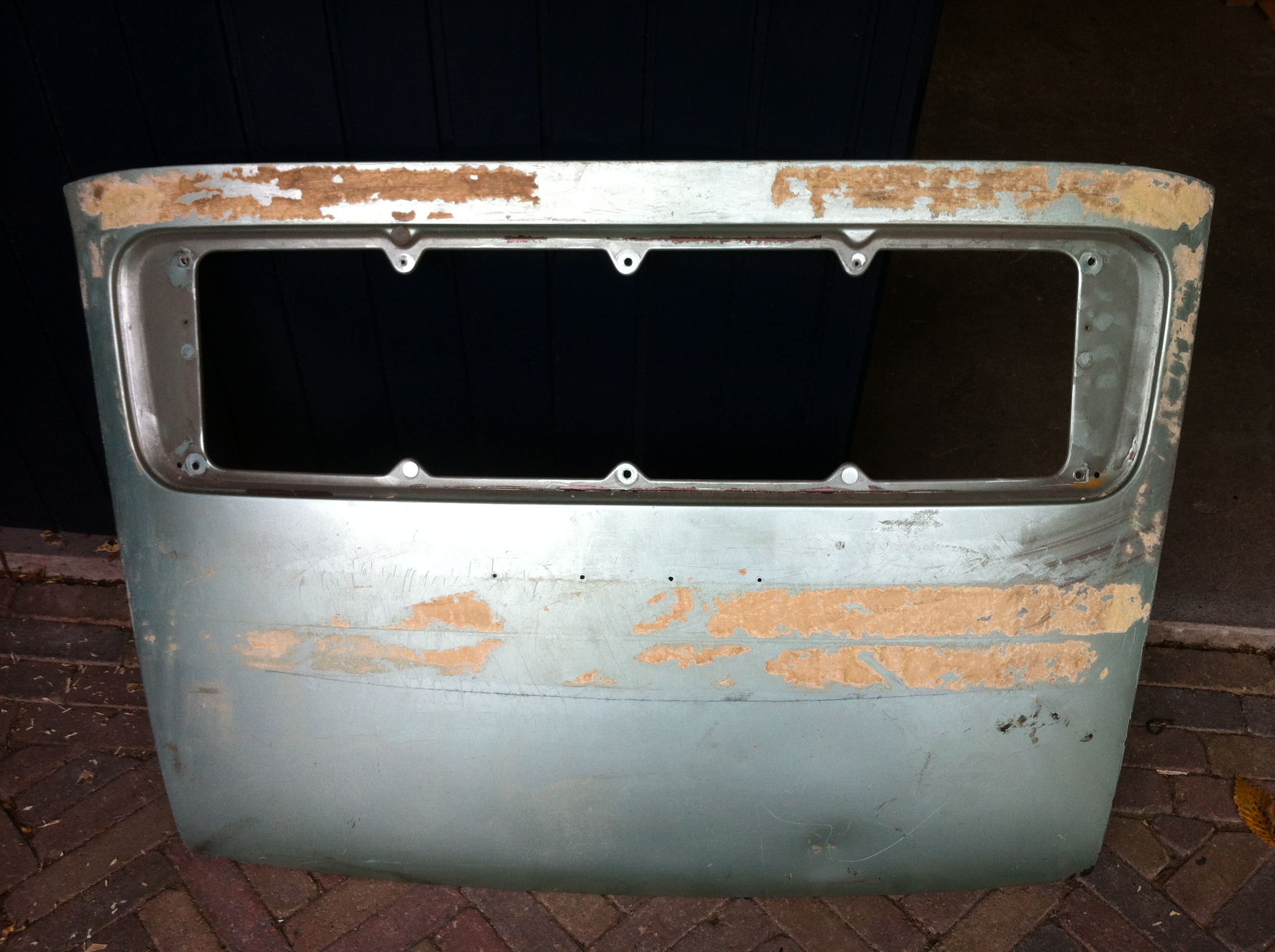 Originele kleur van deze klep is donkerbruin. Het lichtgroene metallic dat er overheen gespoten is laat hier en daar los.