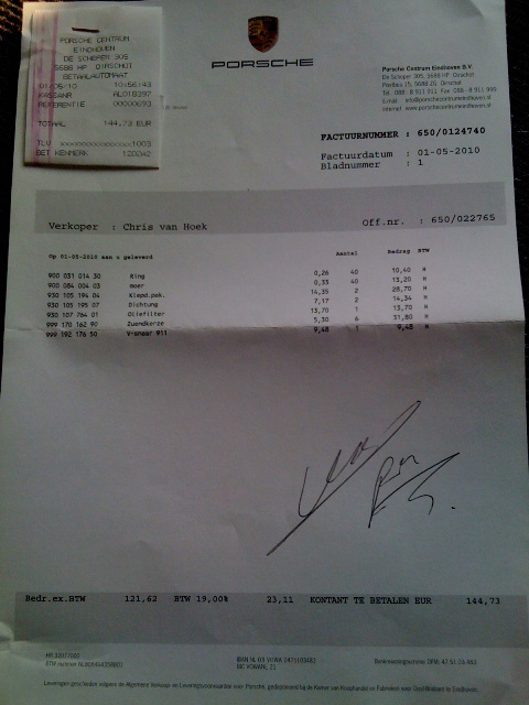 Zoals te zien op de foto`s was de prijs bij Porsche voor deze onderdelen (min oliefilter) 131,03 euro.