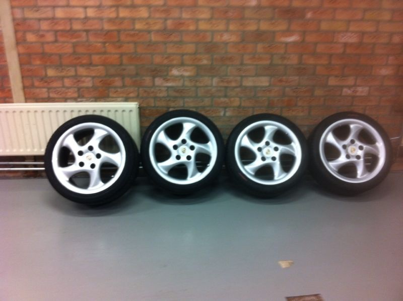 Originele 993 velgen 18 inch met banden die behoorlijk in de weg liggen.