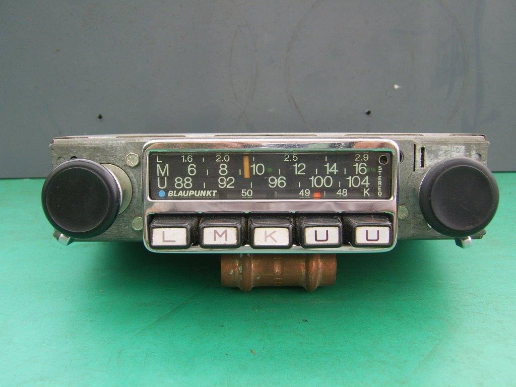 Te Koop: een 1972 blaupunkt frankfurt stereo radio met klein chroom frontje en zwarte knoppen.