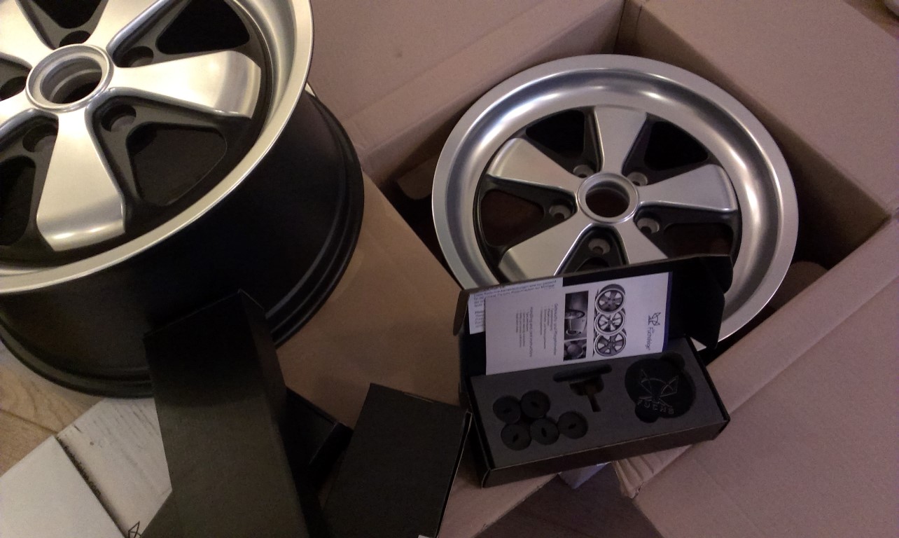 Inclusief zwarte centercaps met Porsche loge + 15mm spacers achteraan (nodig voor onder 964)