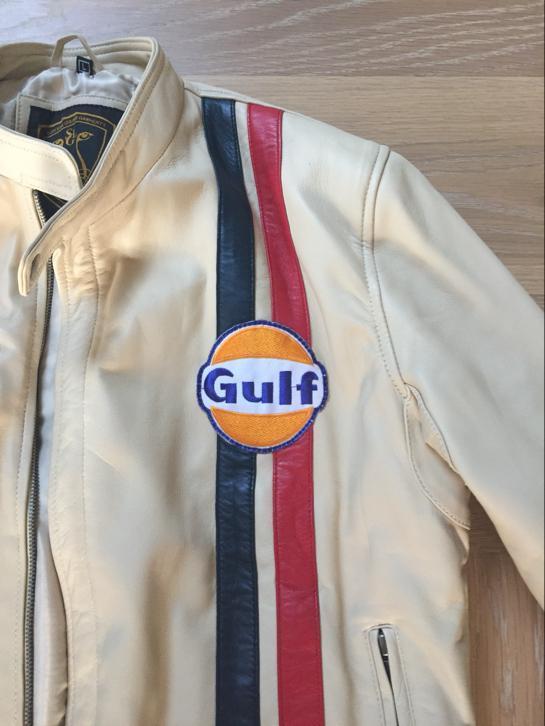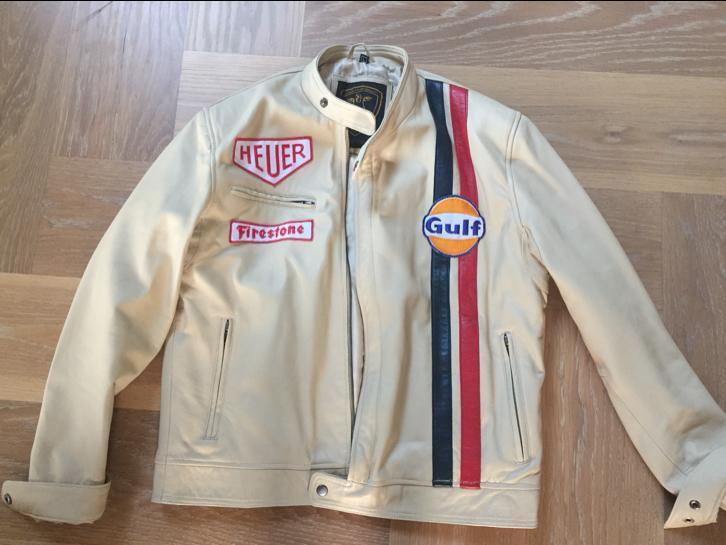 Een replica van het beroemde witte lederen rally / race / LeMans jasje van Steve McQueen. Ongedragen, maat L (maar valt redelijk klein / M) en natuurlijk met de Gulf en Tagheuer logo's. Het is wel echt leer.