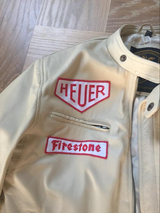 Trefwoorden: rally race jack leder leren lederen wit white Steve McQueen Mac Queen Mc Queen coat jas Porsche Tag Heuer Tagheuer Gulf