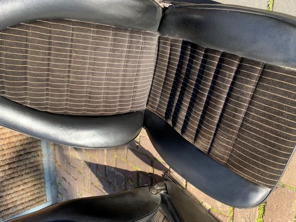 Nette pin stripe voorstoelen, voor 911 maar zijn vlgs mij ook in 924 en 944 geleverd. Schuim/wangen zeeg goede staat, leatherette zeer goede staat. pinstrip van 1 stoel heft lijm vlek en 2 kleine scheurtjes. doe een goed bod en ze zijn voor jou.