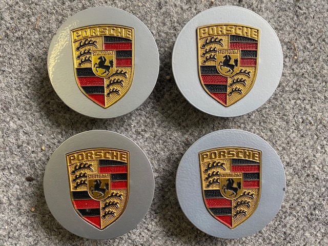 Porsche naafkapjes, metalen versie. Complete set van 4, onbeschadigd. Nieuwstaat.