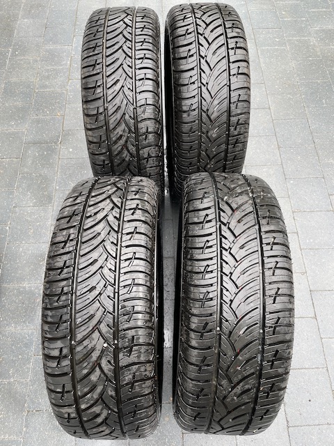 4 met nieuwe banden en de reserveband met een gebruikte band op (165/60 14)