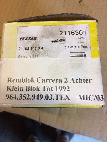 Nieuwe remblokken voor Porsche 964. Originele Textar blokken zoals OEM gemonteerd zit.