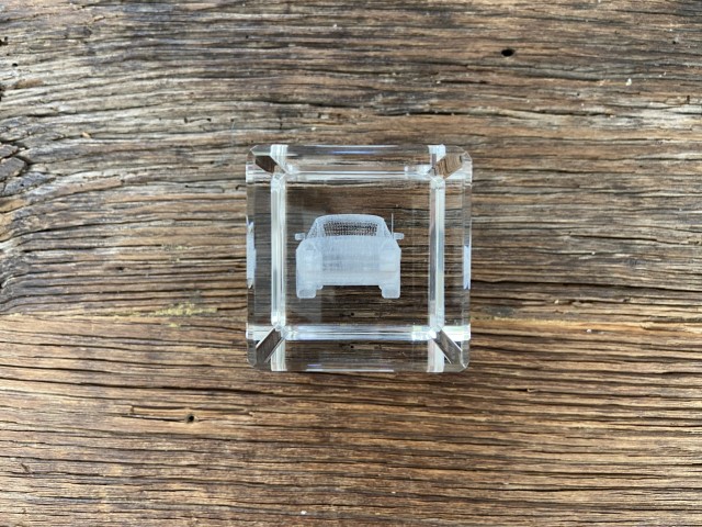 Massief glazen blok (± 8 x 5 x 5 cm) met in het centrum de 3D gravure.