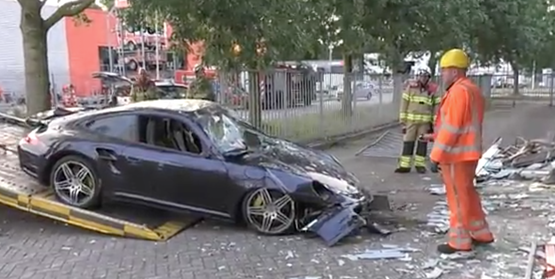 "Naast de dure sportwagen gelukkig geen gewonden gevallen". Dat krijg je met die peperdureporsjes, die worden gewoon een soort familielid. Ome porsj noemen we m bij ons.