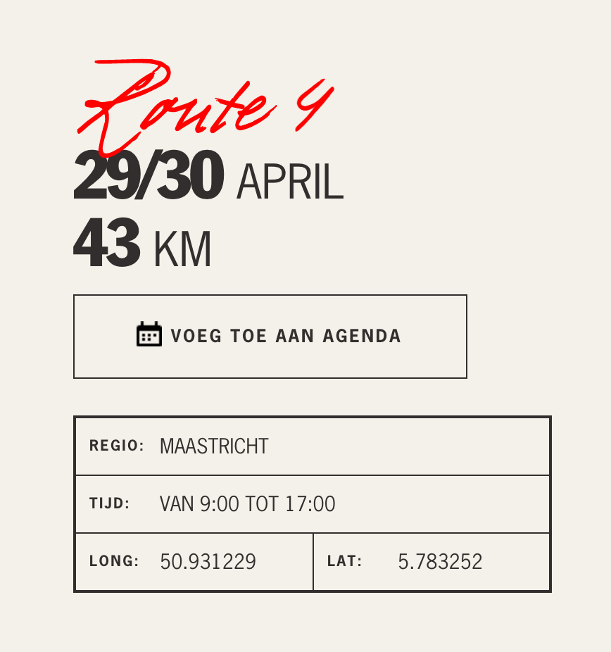 De details voor route 3 zijn nog een verrassing. Wij maken deze uiterlijk 2 weken van tevoren bekend. U kunt zich wel alvast inschrijven. Wij houden u dan op de hoogte.