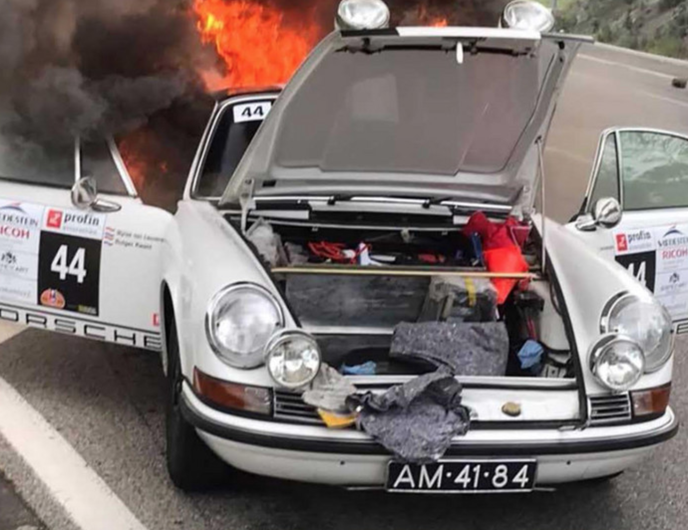 De klassieke 911 van Wytze van Leuveren en Rutger Kwant vloog vermoedelijk in brand als gevolg van een poreuze brandstofslang, zo meldt Porsche-website vierenzestig.nl. De lekkende benzine kwam tot ontbranding en dan is er in de regel geen houden meer aan, ook niet met een brandblusser, aldus de site.
