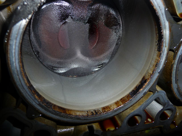 Als er alleen een scheur in de wand zit (vergelijkbaar met een lekke koppakking eigenlijk) dan gaat er bij de compressieslag wellicht een heel klein beetje olie door de scheur maar dat mag geen naam hebben. Gebeurt bij een lekke koppakking namelijk ook niet :idea: Omdat de olie "onder" de zuigerveer blijft en niet in de compressie ruimte komt.