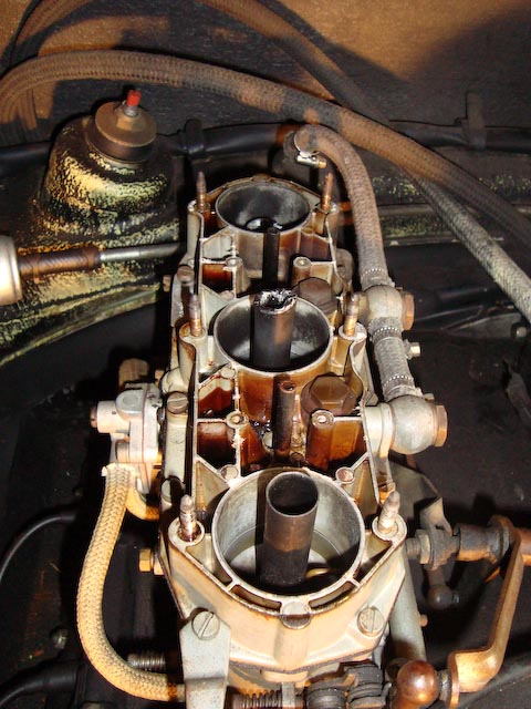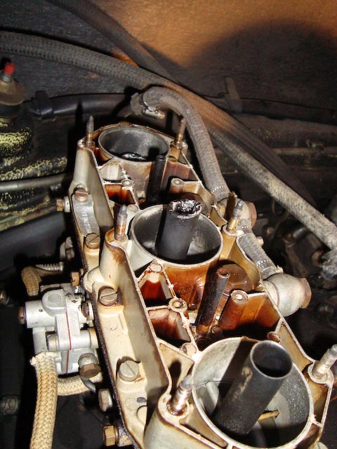 De venturi's zijn door backfire verbrand. (Vlam door inlaat naar boven) Deze venturi's zijn van licht materiaal en kunnen dus snel smelten. Vervangen is erg eenvoudig. 2 helften van de carb van elkaar, klemmetje los peuteren en voorzichtig de venturi eruit halen. Pas op dat je geen bramen op het carb huis krijgt.