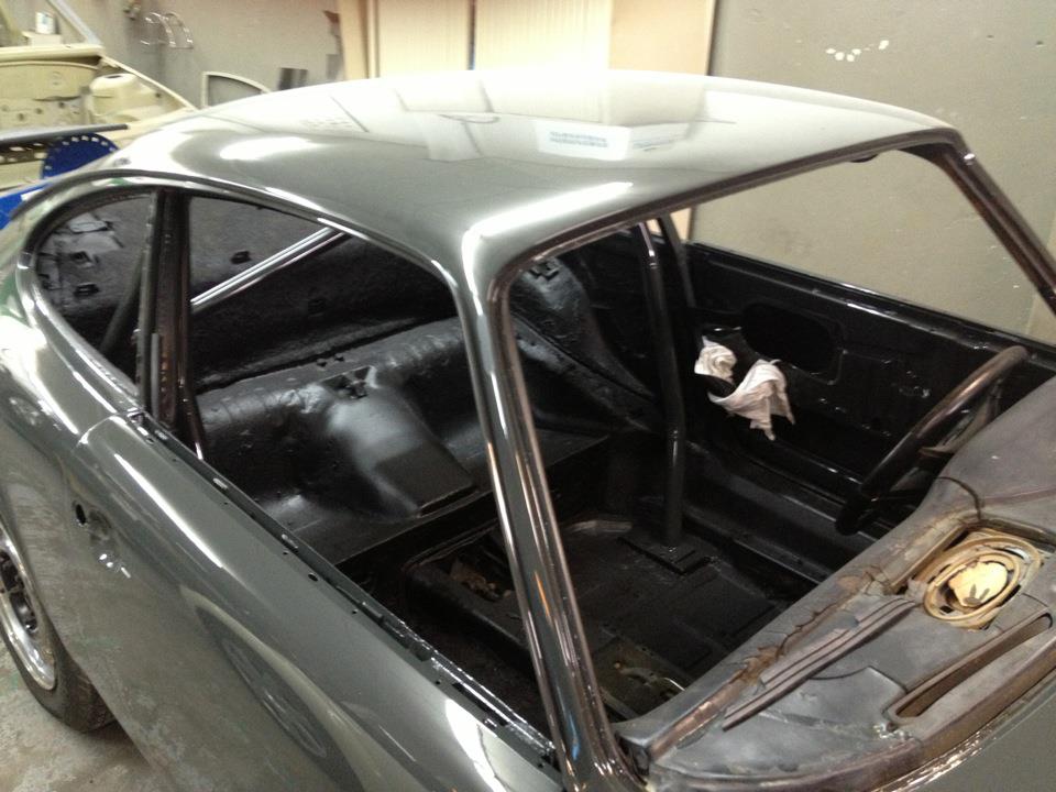 We zijn nu dus zoals op de foto's is te zien bezig met de bumpers, portiersloten, het netjes maken van de raamlijsten, de raammechanismen, deursloten, het pas maken van de verlichtingsunits, kleine cosmetische zaken en de oude hemel ligt bij de stoffeerder om een nieuwe (in zwart) te maken.