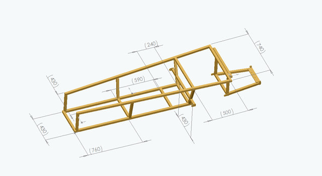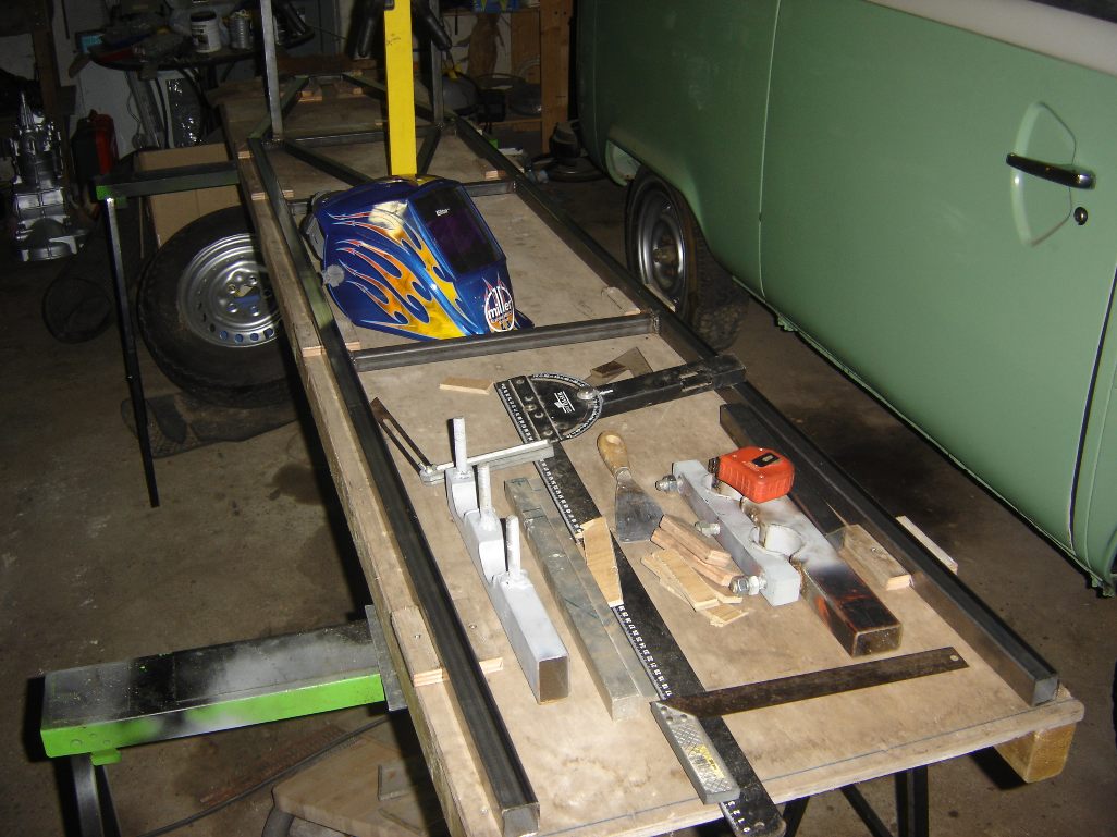 In de tussentijd heb ik wat stalen vierkante buis 2,5 & 3 cm en wat ronde buis 2 cm gehaald bij de plaatselijke ijzerboer en heb ik ook een tafel gebouwd waarop het monoposto chassis gebouwd wordt. DE houten tafel wordt exact waterpas gesteld en voorzien van een duidelijke middenlijn waardoor we een recht chassis kunnen maken. De onderste chassis buisen worden met klossen op de houten tafel verankert en bieden na het vasthechten een goede basis voor de verdere bouw. Het chassis gaat pas van de tafel af als alles is gemonteerd en gemaakt. Hierna wordt het chassis helemaal doorgelast en verder afgewerkt.