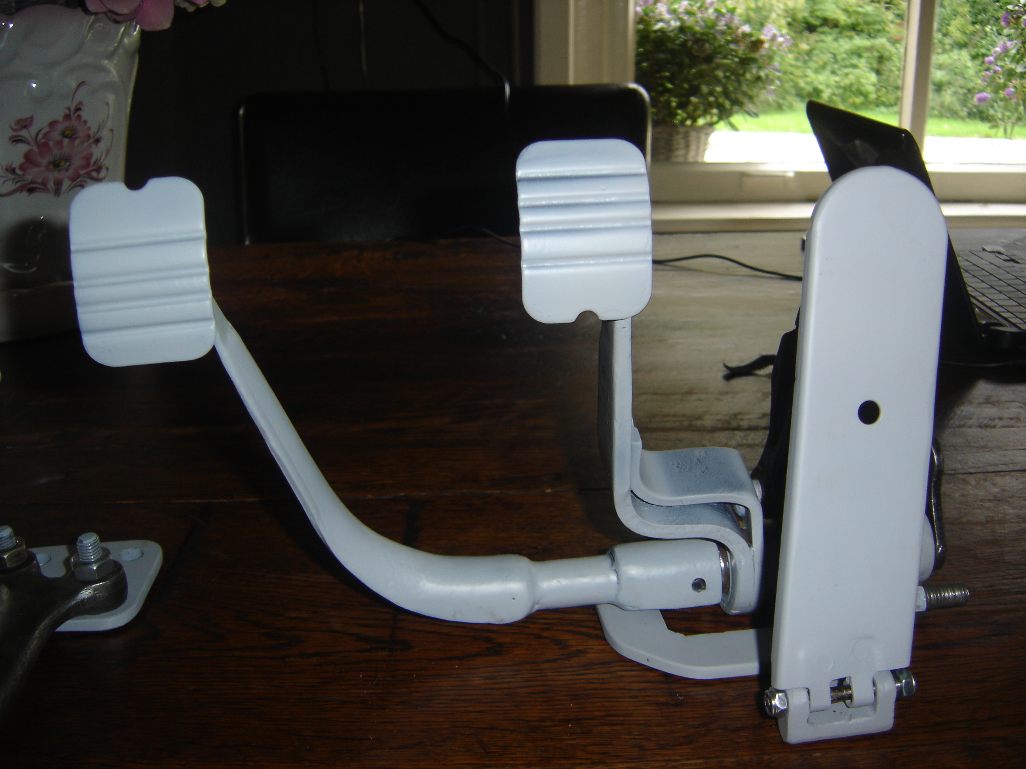De pedalengroep heb ik aangepast. Het koppelingspedaal staat 5 cm verder naar links anders kom je met je raceschoenen vast te zitten op de stuuras. Verder zijn de pedalen 4 cm. ingekort en heb ik een hoefijzer gemaakt met achterin twee inbusbouten waardoor de pedaalhoogte voor de rem en koppeling traploos instelbaar worden.