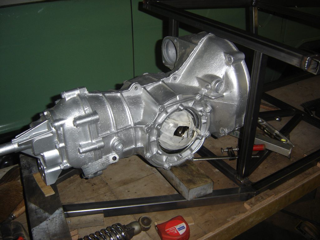 Ook zijn hier de bevestigingspunten aan de zijkant van het chassis te zien waar de armen aan vast komen te zitten die naar de pendelassen gaan. De voor Kever 356 en andere Porsches zo karakteristieke torsieas vering komt hiermee te vervallen. Vering geschiedt met coilovers. Schokbrekers met veren daar om heen. Voorals nog Heb ik tijdelijk een paar bilstein schokbrekers van een BMW motorfiets netjes gemaakt. Hiermee kan ik later bepalen wat er definitief nodig is.