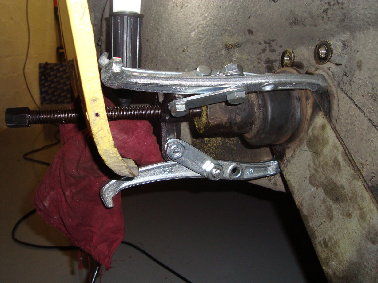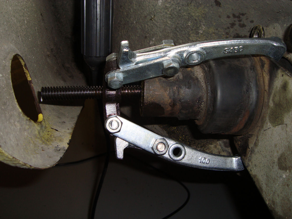 Hij is er uit!!! De grote poelietrekker heeft het gedaan! De plaat is iets krom getrokken bij de poten van de trekker, maar dat lijkt mij niet zo'n probleem. Kost je een paar dagen... maar kan nu eindelijk verder.