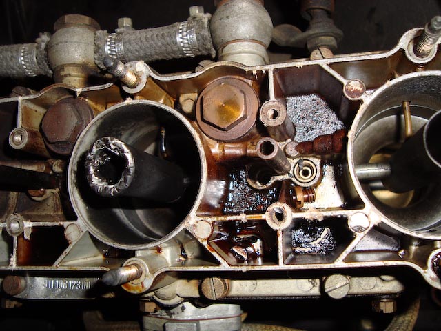 De venturi's zijn door backfire verbrand. (Vlam door inlaat naar boven) Deze venturi's zijn van licht materiaal en kunnen dus snel smelten. Vervangen is erg eenvoudig. 2 helften van de carb van elkaar, klemmetje los peuteren en voorzichtig de venturi eruit halen. Pas op dat je geen bramen op het carb huis krijgt.